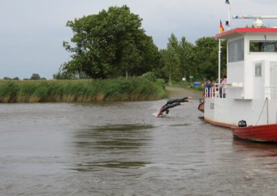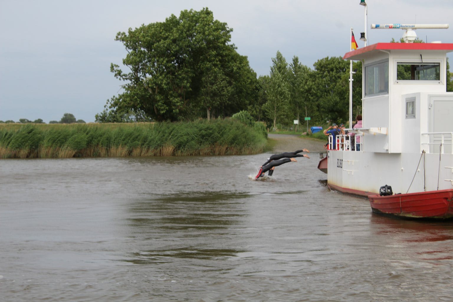 Am 14.08. ging es dann zum zweiten Mal von der Fähre Else in Beidenfleth in der Stör Richtung Kasenort und es galt, mit der Strömung, knapp 7km zu schwimmen. Die äußeren Bedingungen waren in diesem Jahr etwas schwieriger, aber alle haben es ins Ziel geschafft. Sicher begleitet wurden die Schwimmer*innen durch viele SUP´s und Kanus. Ein tolles Bild auf der Stör!!